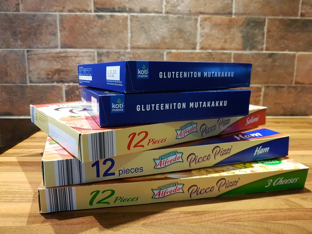 Tarjoiluissa piti ottaa huomioon gluteenittomuus ja maidottomuus, jolloin kauppojen tarjoamiin tuotteisiin turvautuminen on turvallisinta. Pakasteesta löytyvä gluteeniton mutakakku ei paljoa itseleivotulle häviä ja lisäksi pöydästä löytyi keliaakikolle gluteenittomia karjalanpiirakoita. Muut saivat Lidlin pikkupitsoja, joita ei oltu turhaan etukäteen ylistetty. Niin mutakakku, kun pitsatkin olivat hinta-laatusuhteeltaan niin kohdillaan, että niiden tarjoilu oli täysin perusteltua. Kakun ja suolaisten lisäksi tarjolla oli sipsejä ja pikkuleipiä.
